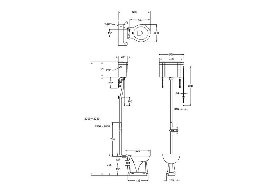 Sædehøjde 42 cm. Skyllearmen kan føres op eller ned for 3 eller 6 liters skyl. Kan justeres til henholdsvis 2,5 og 4,5 liter.